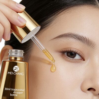This 30ml creative trapezoid-shaped rotating unlock dropper glass bottle is made of high borosilicate glass and features an integrated rotating dropper design, blending aesthetics with functionality. Simply rotate to unlock the dropper, press to dispense, eliminating lost caps. Its superior sealing effectively preserves serum activity. The frosted bottle body and metallic rotating cap create a luxurious visual contrast, ideal for high-end skincare brands.