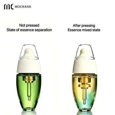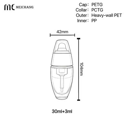 This PETG 30ml+3ml airless dual chamber bottle is specifically designed for water-oil dual phase serum formulations, enabling the combination of oil-soluble botanical actives and water-based functional essences.